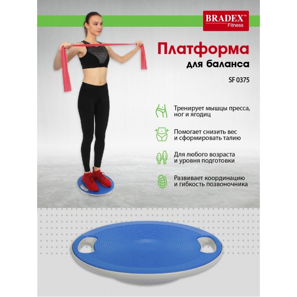 Bradex SF 0376 - балансировочная платформа, которая имеет две активные половины. Первая пригодится для тренировки на фитболе, вторая представляет собой жесткую платформу для развития координации. Есть крепление для эспандеров (входят в поставку, нагрузка до 10 кг).