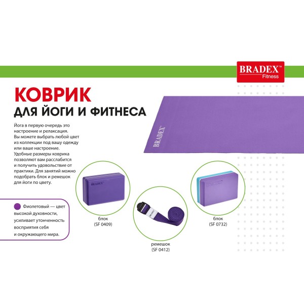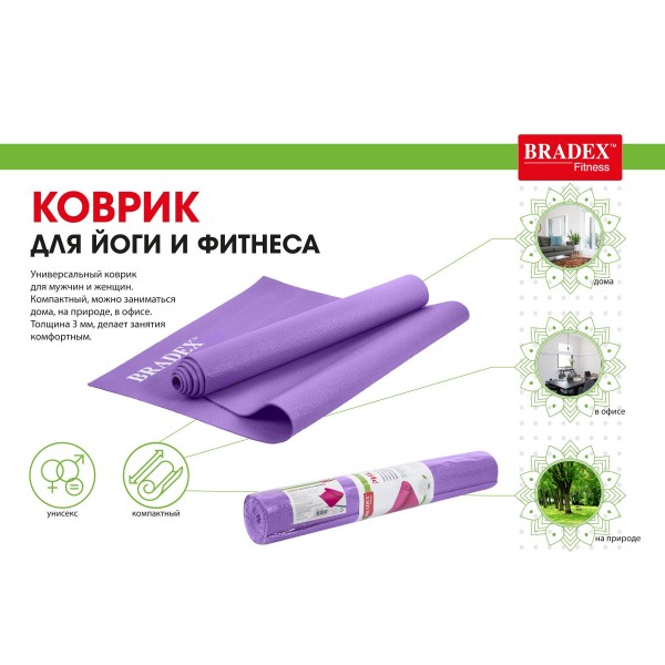 Коврик для йоги Bradex SF 0397 выполнен из нескользящего нерастяжимого ПВХ. Поверхность водоотталкивающая. Дополнительно можно купить блок и ремешок подходящего цвета.