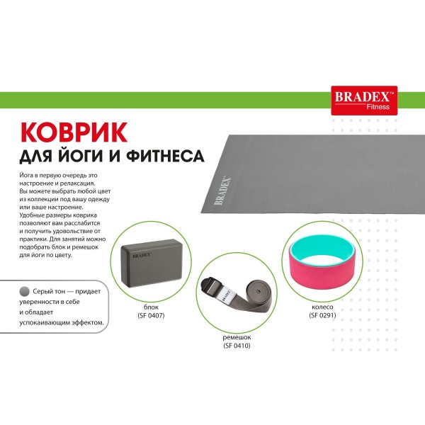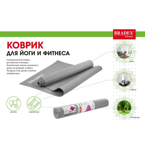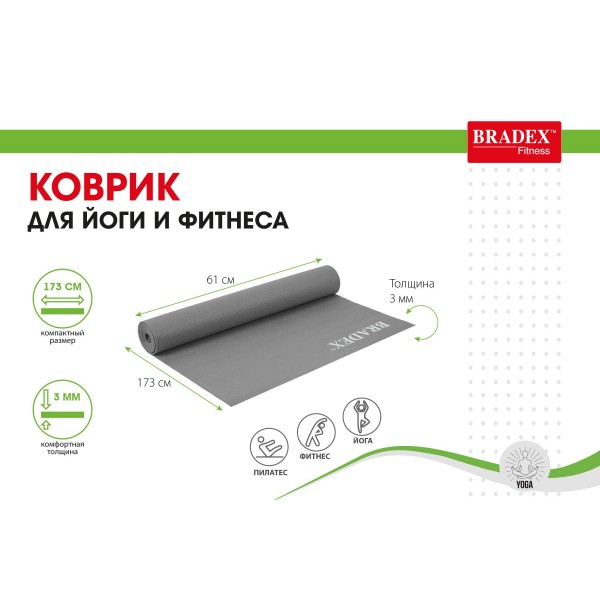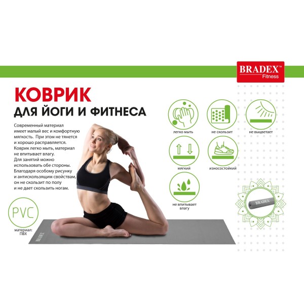 Коврик для йоги Bradex SF 0398 выполнен из нескользящего нерастяжимого ПВХ. Поверхность водоотталкивающая. Дополнительно можно купить блок и ремешок подходящего цвета.