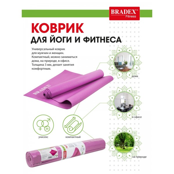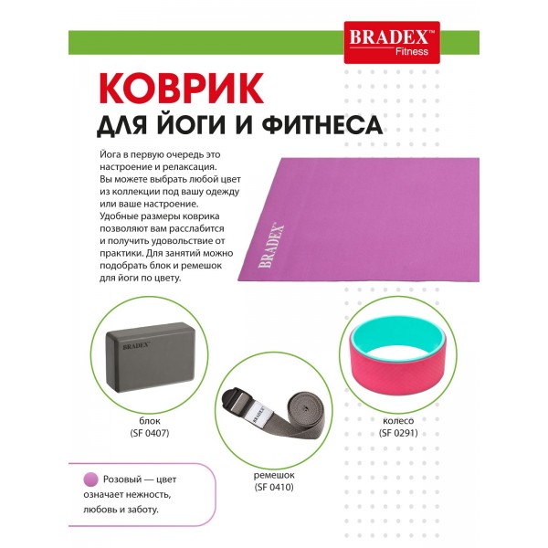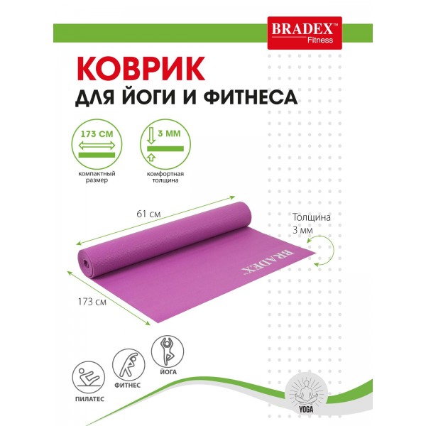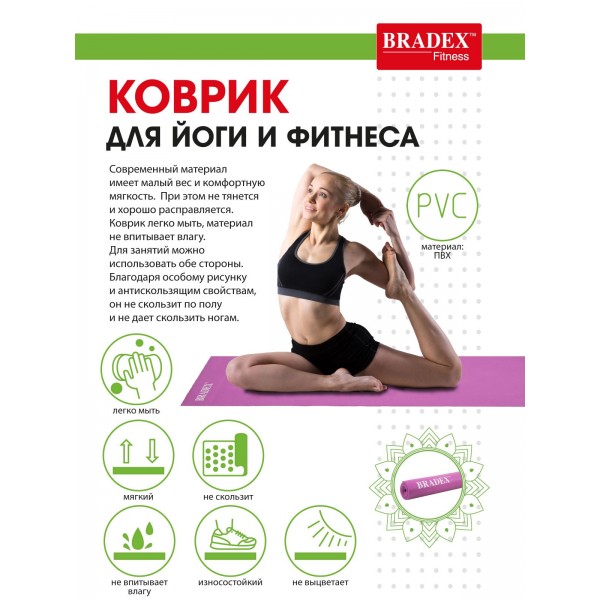 Коврик для йоги Bradex SF 0401 выполнен из нескользящего нерастяжимого ПВХ. Поверхность водоотталкивающая. Дополнительно можно купить блок и ремешок подходящего цвета.