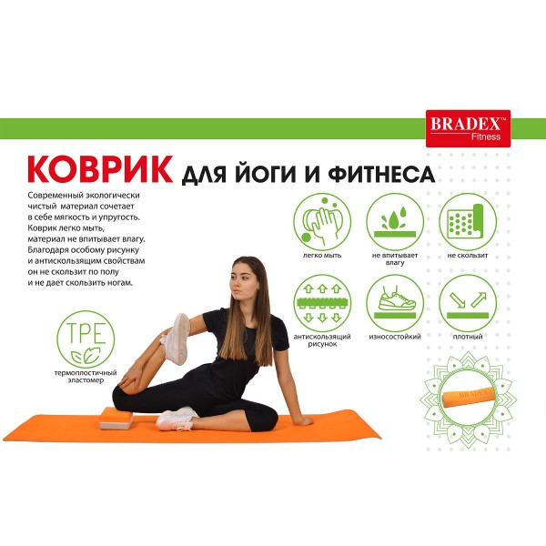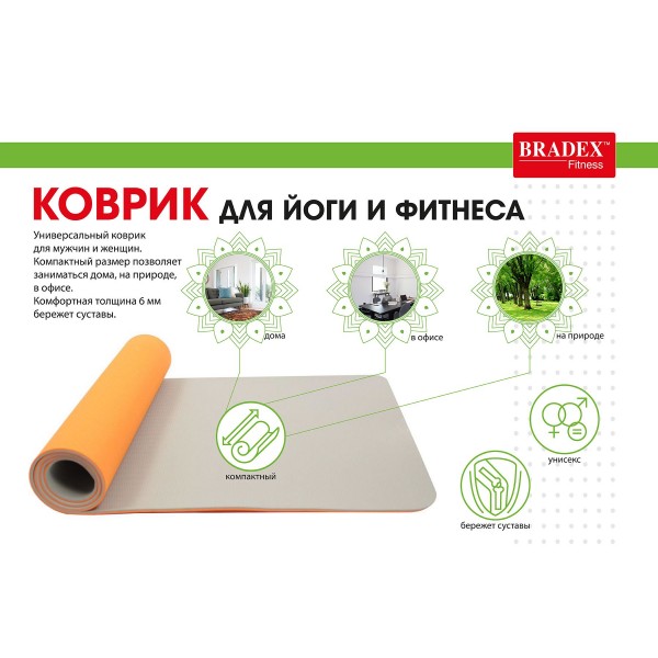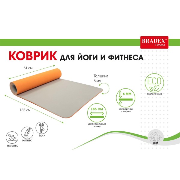 Коврик для йоги Bradex SF 0403 изготовлен из материала TPE, за счет чего отлично фиксируется на поверхности пола и не скользит во время занятия. Толщина 6 мм отлично защищает суставы и будет комфортна для новичков.