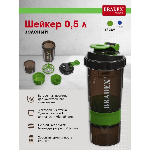 Шейкер Bradex SF 0507 поможет смешать вкусный и полезный коктейль быстро и в любое удобное время. Модель со встроенной пружиной для бесшумного приготовления напитка. Есть 2 отсека для порошка и отдельный отдел на 3 секции для таблеток и капсул.