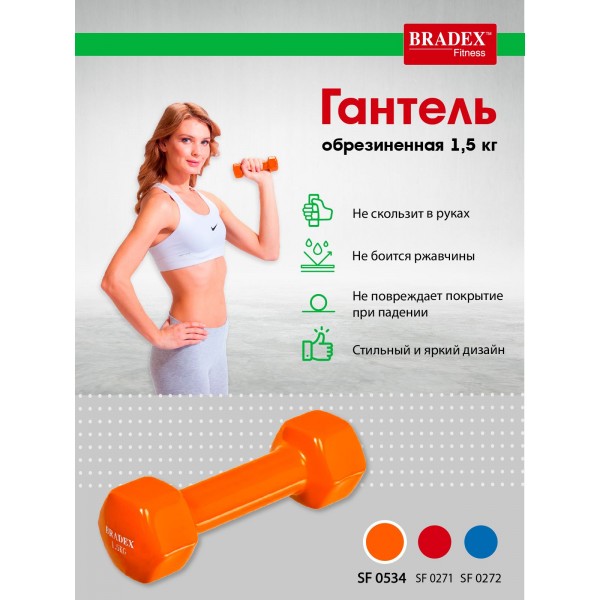 Гантель Bradex SF 0534 имеет резиновое покрытие, которое бережет руки от мозолей, а поверхность пола от следов ударов в случае падения. Вес 1,5 кг.