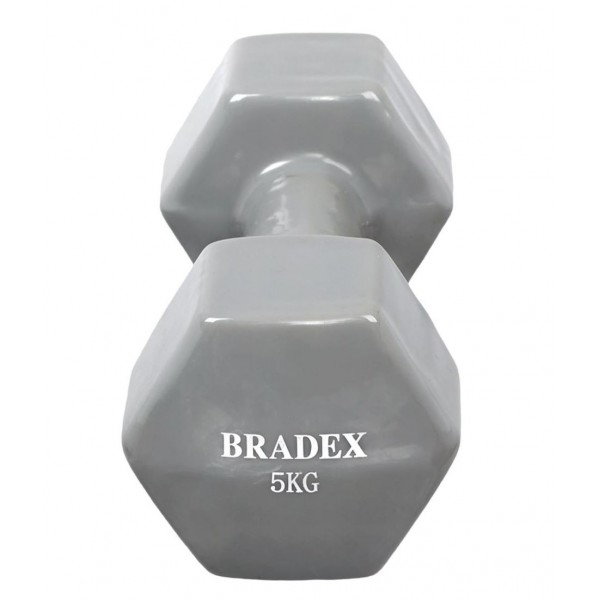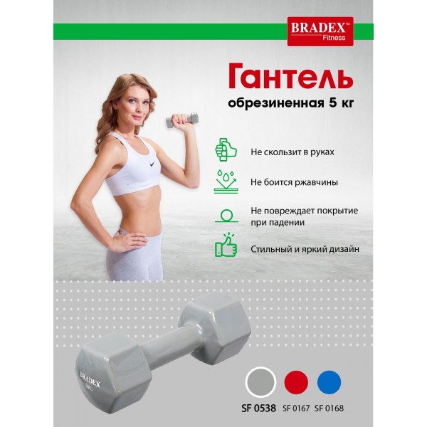 Гантель Bradex SF 0538 имеет резиновое покрытие, которое бережет руки от мозолей, а поверхность пола от следов ударов в случае падения. Вес 5 кг.