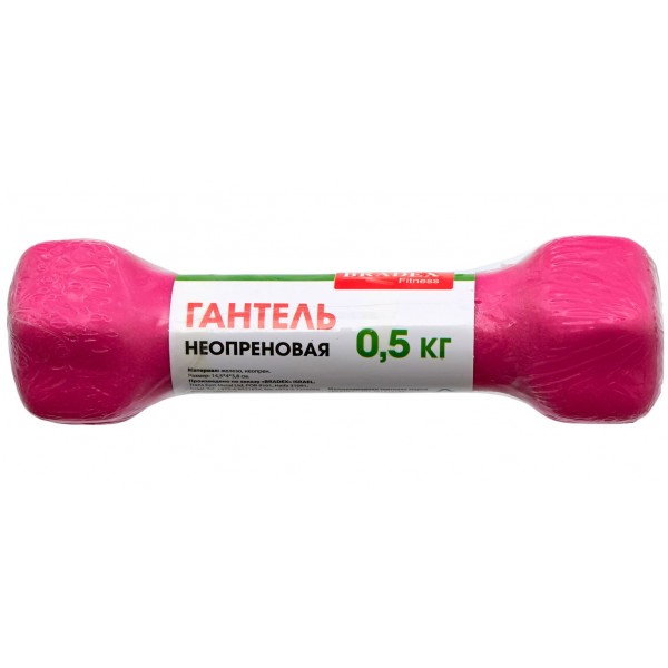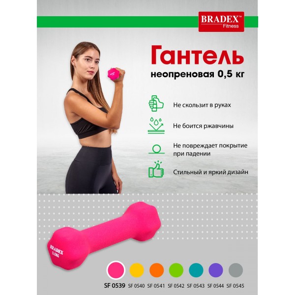 Гантель Bradex SF 0539 имеет неопреновое покрытие, которое бережет руки от мозолей, а поверхность пола от следов ударов в случае падения. Вес 0,5 кг.