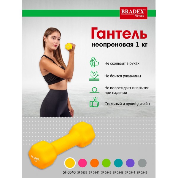 Гантель Bradex SF 0540 имеет неопреновое покрытие, которое бережет руки от мозолей, а поверхность пола от следов ударов в случае падения. Вес 1 кг.