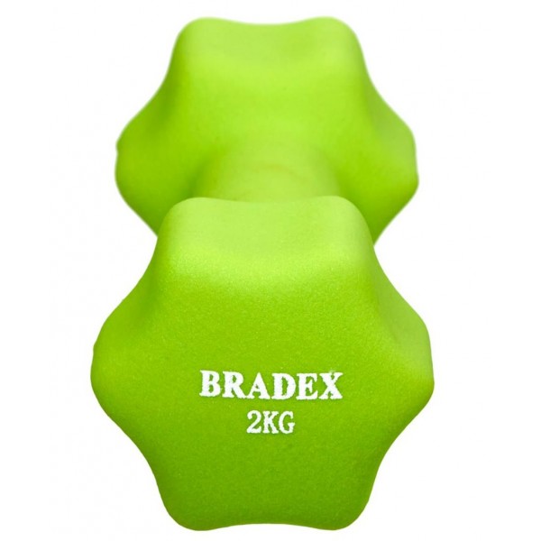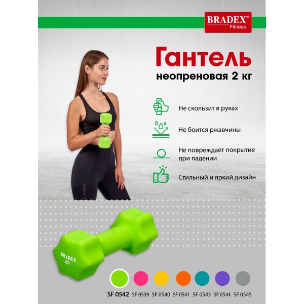 Гантель Bradex SF 0542 имеет неопреновое покрытие, которое бережет руки от мозолей, а поверхность пола от следов ударов в случае падения. Вес 2 кг.