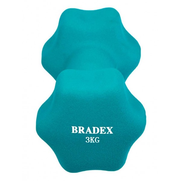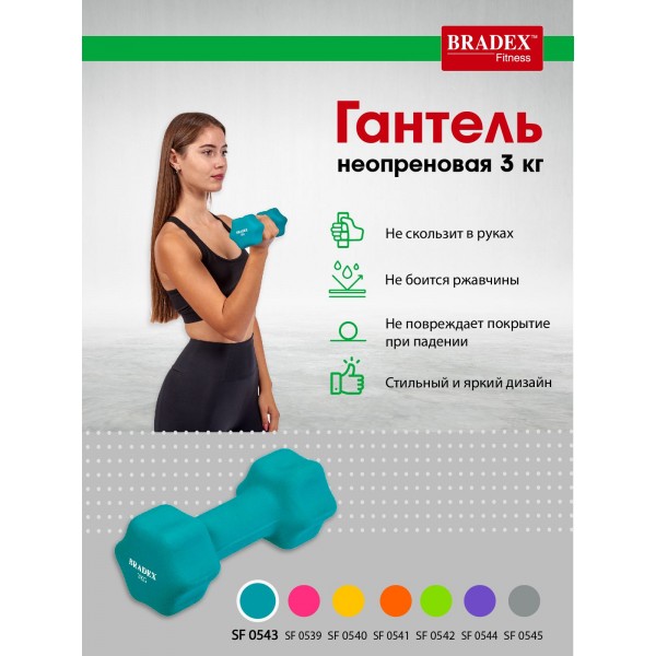 Гантель Bradex SF 0543 имеет неопреновое покрытие, которое бережет руки от мозолей, а поверхность пола от следов ударов в случае падения. Вес 3 кг.