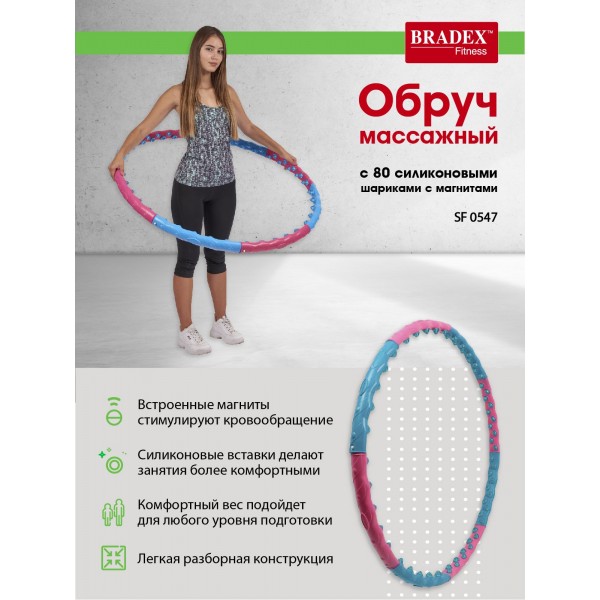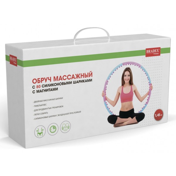 Обруч массажный Bradex SF 0547 имеет двойной ряд силиконовых шариков (80 шт) и увеличенный вес для повышения эффективности вращения снаряда. Модель быстро собирается из восьми секций. Конструкция включает магнитные вставки для стимуляции кровообращения.