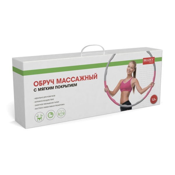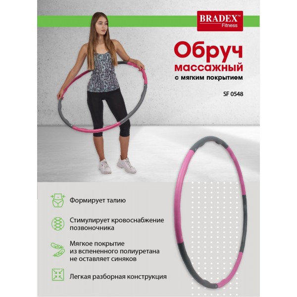Обруч массажный Bradex SF 0548 изготовлен из пластика и вспененного полиуретана. Эта модель подойдет для новичков или людей с нежной кожей, поскольку такое покрытие не оставляет синяков.