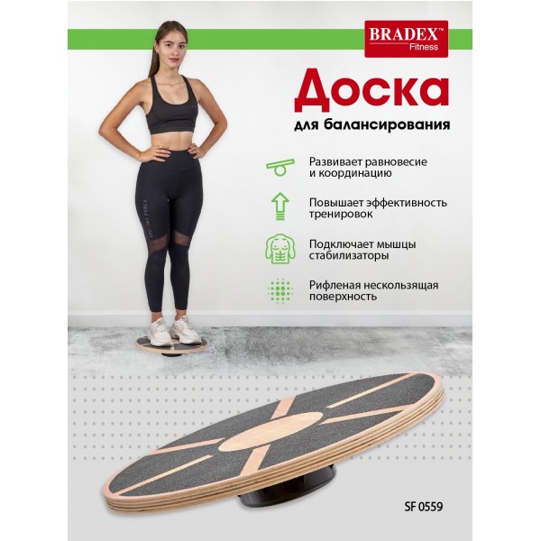 Bradex SF 0559 - балансировочная доска с прочной платформой из МДФ. Выполняя упражнения на такой нестабильной поверхности, спортсмен может включить в работу дополнительные группы мышц, развить координацию и ловкость.