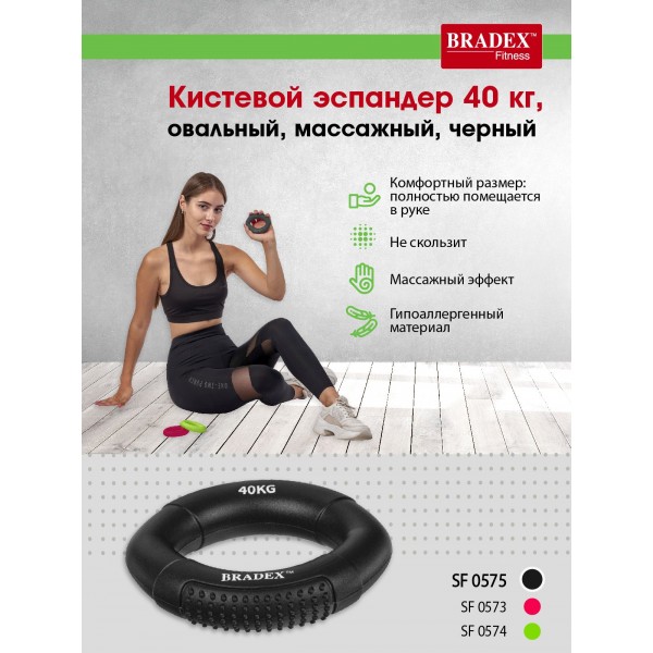 Bradex SF 0575 - кистевой эспандер эргономичной овальной формы. На одной стороне есть выемки для пальцев, с другой стороны сделана рельефная поверхность для массажного воздействия на ладонь.