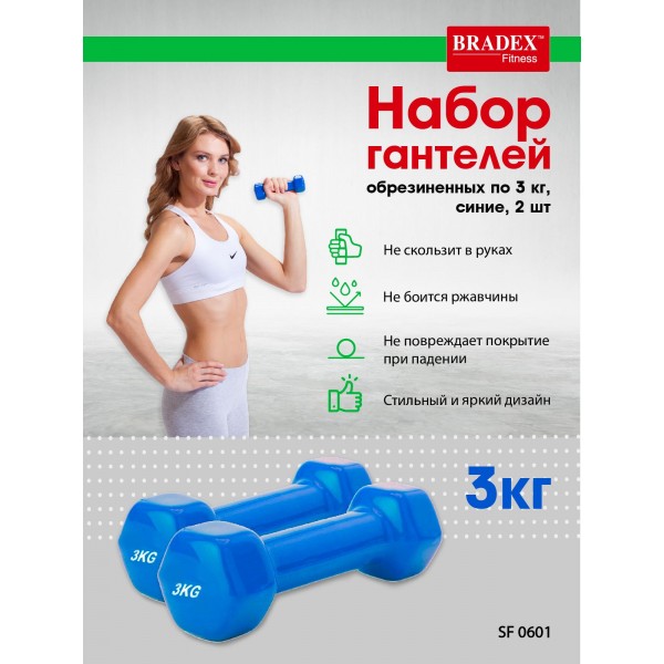 Гантели Bradex SF 0601 имеет резиновое покрытие, которое бережет руки от мозолей, а поверхность пола от следов ударов в случае падения. Вес по 3 кг, 2 шт.