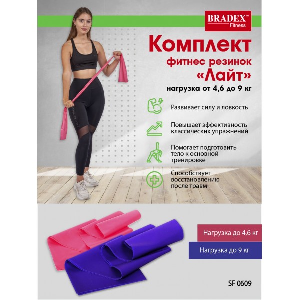 Набор фитнес-резинок Bradex Лайт SF 0609 состоит из двух эластичных ленточных эспандеров разного сопротивления.