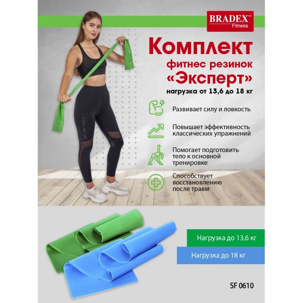 Набор фитнес-резинок Bradex Эксперт 13,6-18 кг SF 0610 состоит из двух эластичных ленточных эспандеров разного сопротивления.