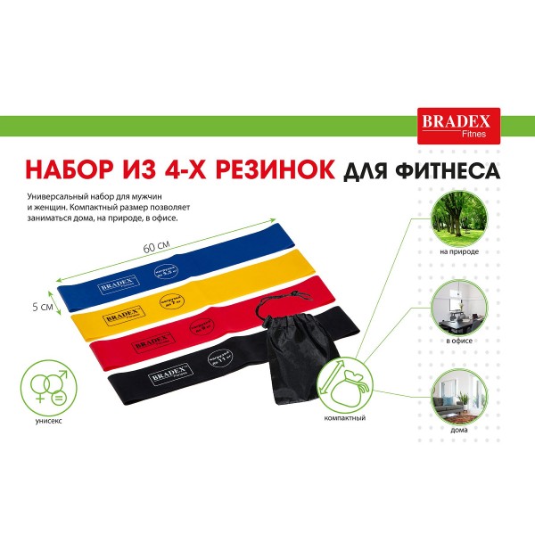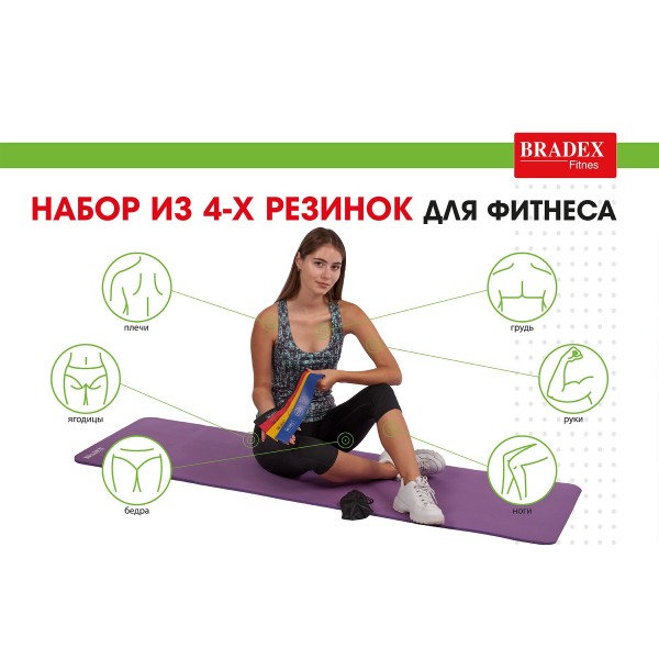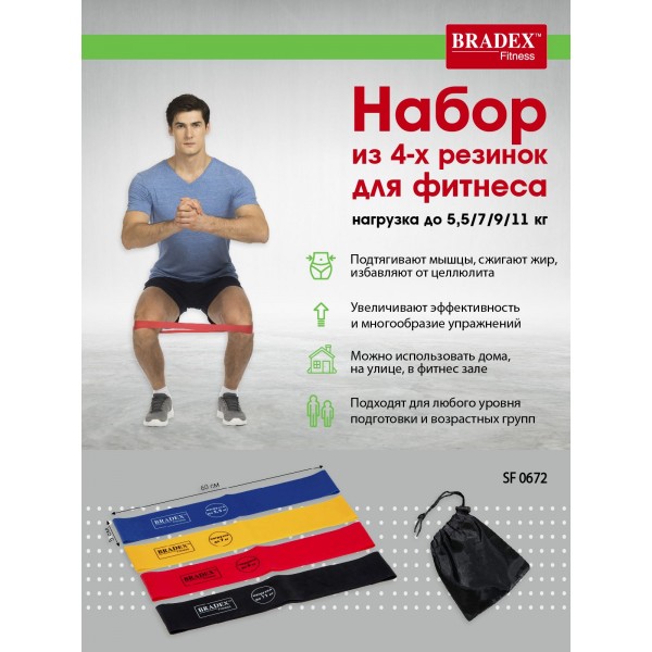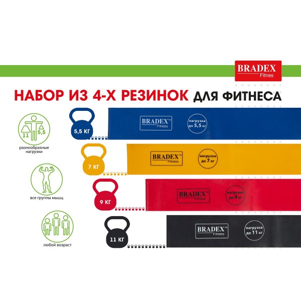 Набор фитнес-резинок Bradex SF 0672 состоит из четырех эластичных лент для выполнения упражнений с нагрузкой. Каждая лента имеет своё сопротивление, их можно комбинировать для получения нужной нагрузки.