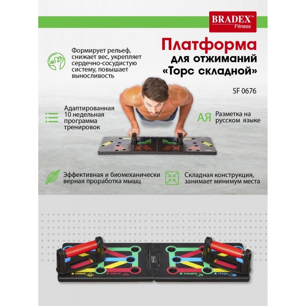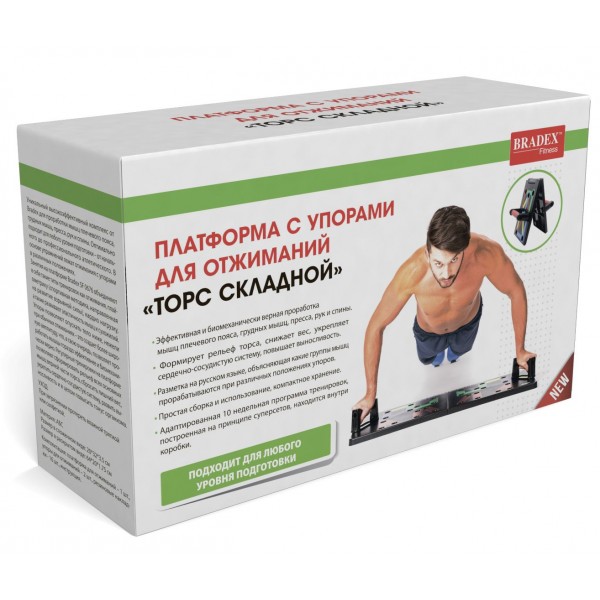 Bradex ТОРС SF 0676 - специальная складная платформа для выполнения отжиманий. Спортсмен сможет проработать различные группы мышц переставляя ручки по разметке на поверхности. Прилагается тренировочный комплекс упражнений на 10 дней.