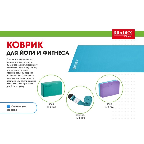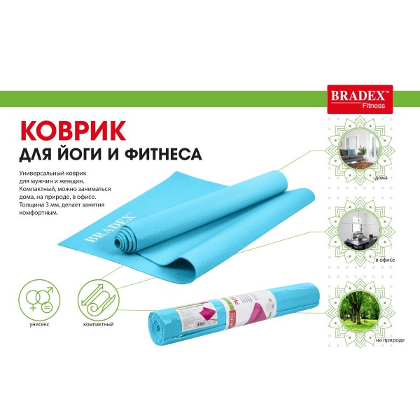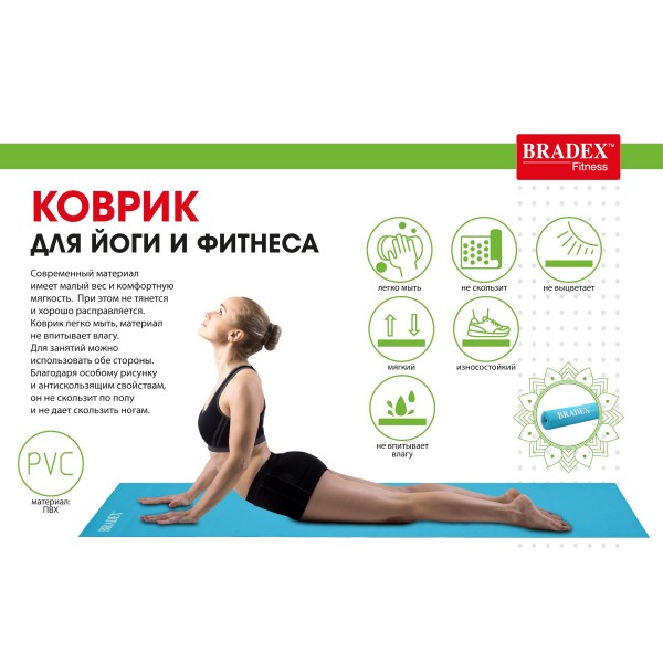 Коврик для йоги Bradex SF 0678 выполнен из нескользящего нерастяжимого ПВХ. Поверхность водоотталкивающая. Дополнительно можно купить блок и ремешок подходящего цвета.