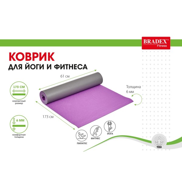 Коврик для йоги Bradex SF 0687 выполнен из плотного ПВХ материала. За счет дополнительной толщины занятие будет более комфортным. На задней стороне расположены антискользящие точки для большей устойчивости.