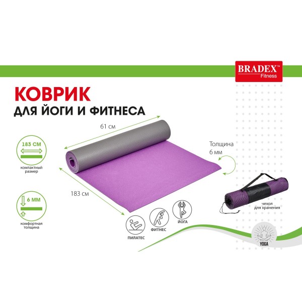 Коврик для йоги Bradex SF 0691 выполнен из плотного ПВХ материала. За счет дополнительной толщины занятие будет более комфортным. На задней стороне расположены антискользящие точки для большей устойчивости.