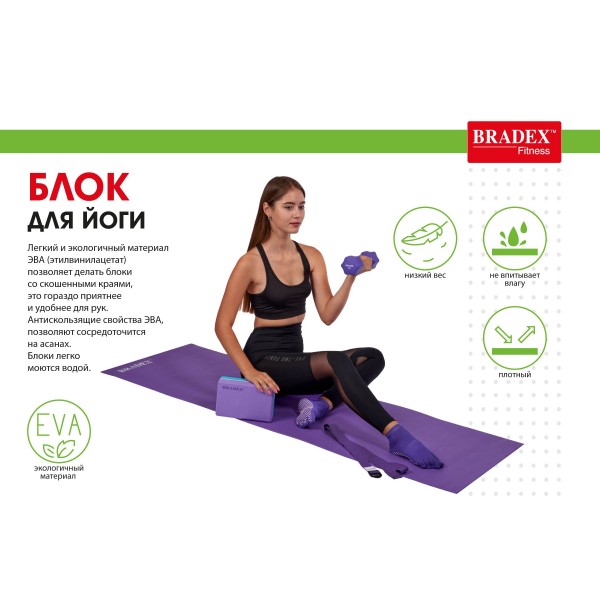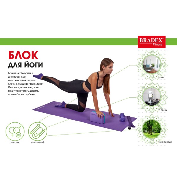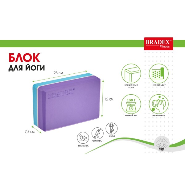 Блок для йоги Bradex SF 0732 - удобный дополнительный снаряд для растяжки и других упражнений. Такой опорный кирпич имеет форму со скошенными углами и нескользящую поверхность.