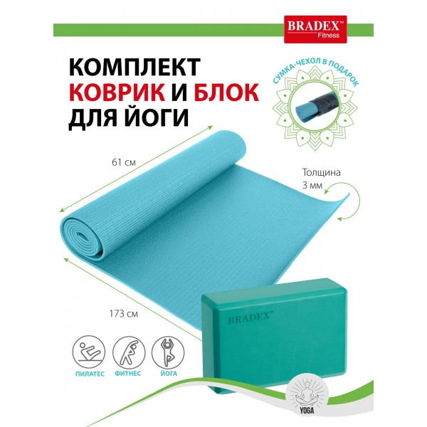 Коврик для йоги Bradex SF 0807 комплектуется блоком, а удобная сумка с сеткой прилагается в подарок.