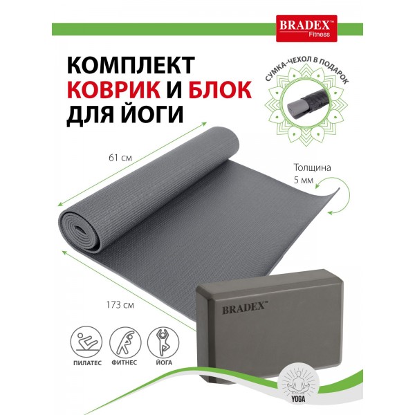 Коврик для йоги Bradex SF 0810 комплектуется блоком, а удобная сумка с сеткой прилагается в подарок.