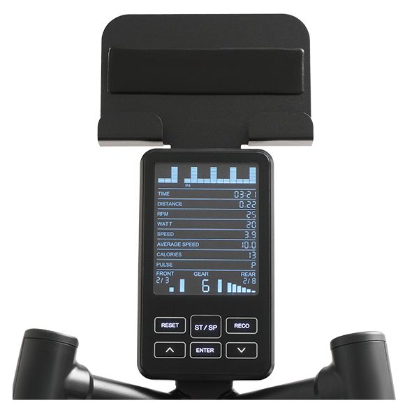 Маховик на 15 кг позволяет задать 32 уровня сложности, регулировка электронная. Положение спортивного седла и руля индивидуально подбираются под конкретного пользователя. Проверка работы сердца может быть проведена как через встроенные сенсоры, так и беспроводным кардиопоясом (в комплекте).