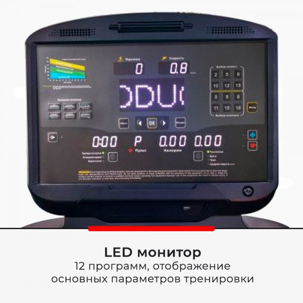 На экране консоли будут видны все важные параметры забега. Спортсмен может выбрать одну из 12 программ, в том числе пульсозависимую тренировку, или создать пользовательский режим со своими настройками. Модель также имеет: