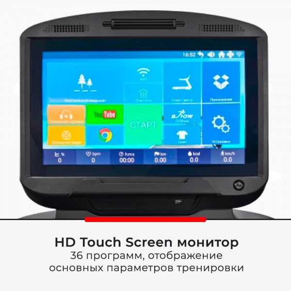 Современный сенсорный дисплей TFT HD позволяет полностью погрузиться в приложения с виртуальным ландшафтом, которые можно подключить к тренажеру через Wi-Fi. Также на тренажере установлены: