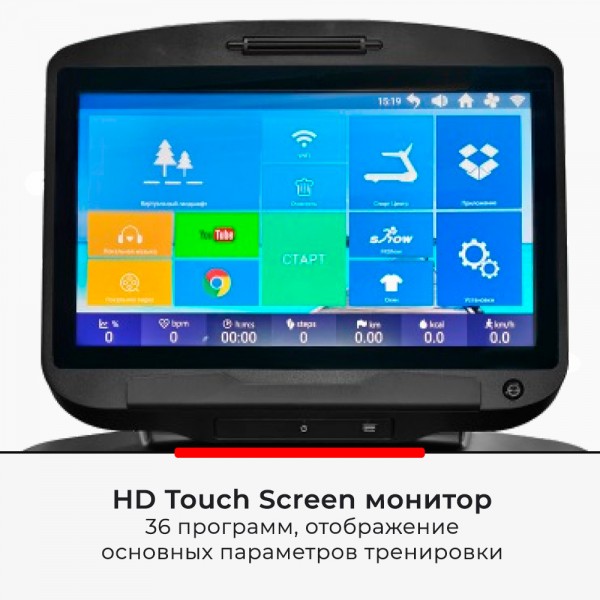 Большой сенсорный дисплей позволяет полностью ощутить преимущество тренировки с виртуальным ландшафтом. Тренажер также имеет: