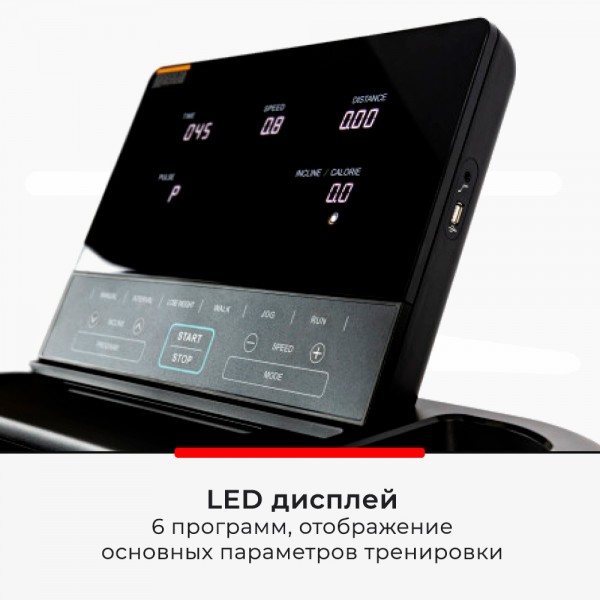 Консоль модели информирует спортсмена о ходе тренировки. Есть шесть встроенных программ. Дорожка также оснащена: