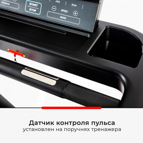 Габариты бегового полотна рассчитаны на пользователей разного роста, есть регулировка наклона для дополнительного контроля нагрузки. Максимальная скорость 18 км/ч. Сенсоры пульса встроены в поручни, возможно подключение кардиопояса (в комплект не входит).
