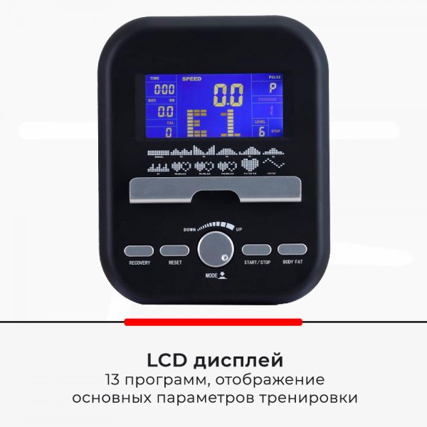 На современном LCD экране будут видны все основные характеристики тренировки. Среди 13 встроенных программ предусмотрены: