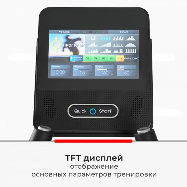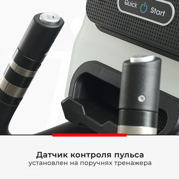 Частоту пульса передают сенсоры на поручнях, есть возможность использования кардиопояса (в комплект не входит). Консоль с контрастным 10 дюймовым LCD монитором и подсветкой отображает все необходимые параметры тренировки, а встроенные динамики позволяют прослушивать любимые мелодии.