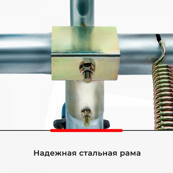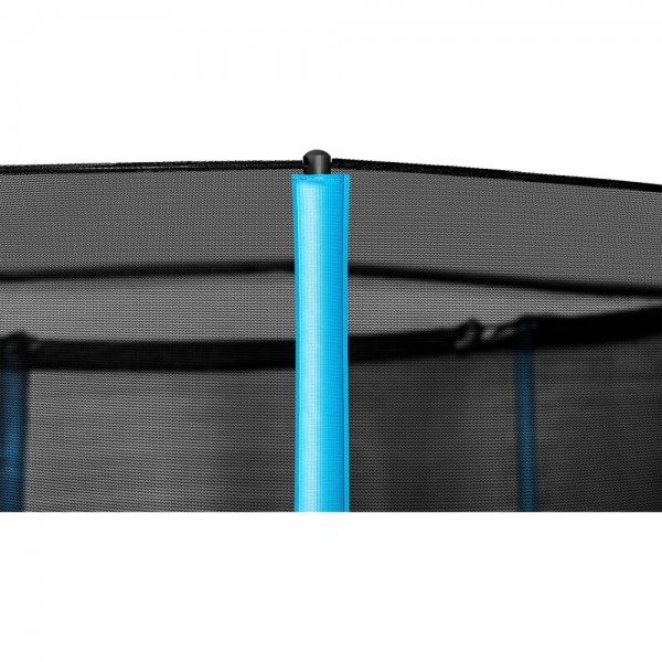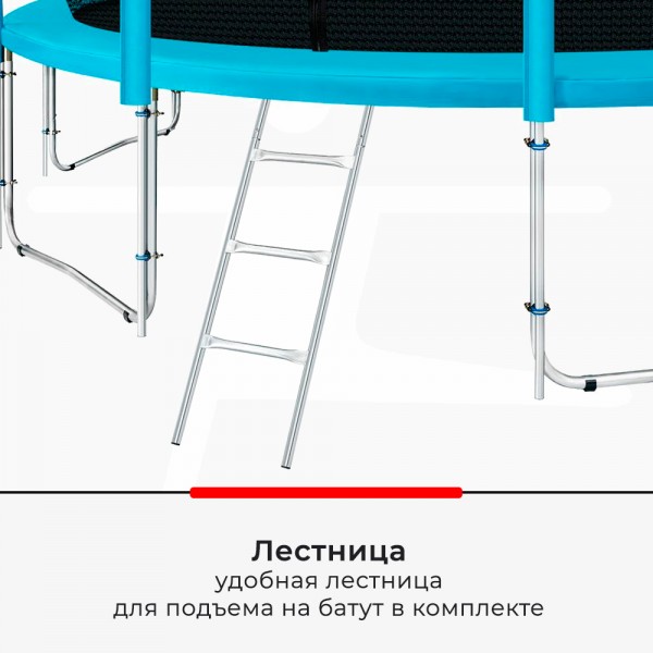 Усиленный каркас батута сочетается с прочными пружинами и надежным прыжковым полотном из Перматрона. Защитная сеть двойного плетения исключает прикосновение к пружинному блоку, на входе установлена усиленная молния с карабинами. Возможна установка баскетбольного кольца (в комплект не входит).