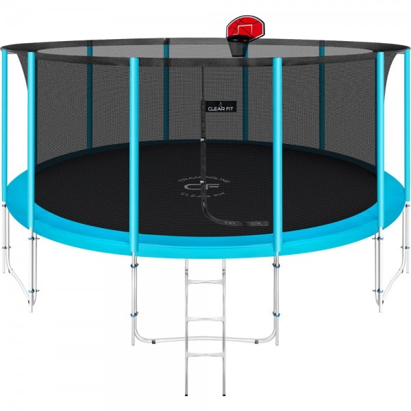 Усиленный каркас батута сочетается с прочными пружинами и надежным прыжковым полотном из Перматрона. Защитная сеть двойного плетения исключает прикосновение к пружинному блоку, на входе установлена усиленная молния с карабинами. Возможна установка баскетбольного кольца (в комплект не входит).