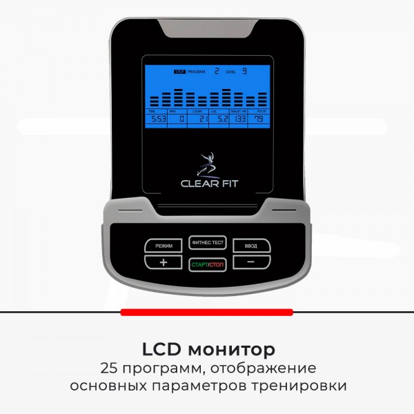 На контрастном экране пользователь может наблюдать все показатели текущей тренировки. В память тренажера записаны программы и тесты, среди которых: