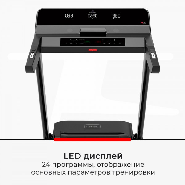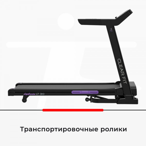 Clear Fit LifeCardio LT 30 – беговая дорожка с более мощным мотором и электронной настройкой наклона. Средняя модель в линейке LifeCardio с увеличенным беговым полотном и дополнительными программами.