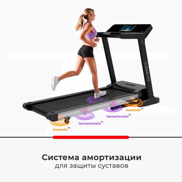 Модель оснащена мощным мотором на 4 л. с. и декой коммерческого типа толщиной 20 мм, что в комплексе с усиленной рамой позволяет комфортно тренироваться людям весом до 160 кг. Большое беговое полотно и новая адаптивная амортизация из элементов SpringVariable™ и CoversAir ™ делают забег комфортным и безопасным.