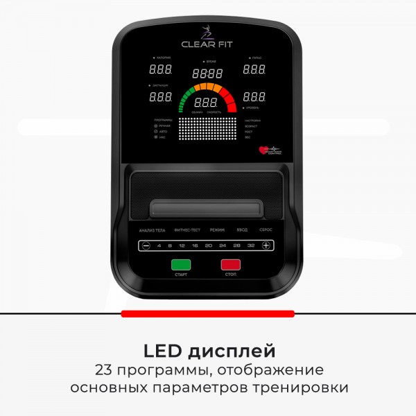 Clear Fit MaxPower X 550 – эллипсоид с возможностью изменения наклона и большой длиной шага. Модель с многофункциональной консолью и ограничением веса 150 кг.