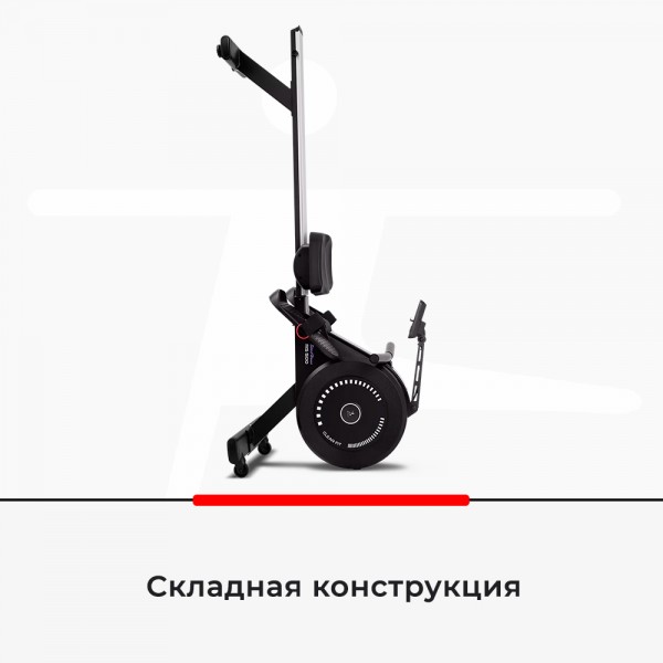 Тренажер выполнен на стальном треке. Используются качественные направляющие из алюминия и надежные подшипники. Установлена гибридная (аэродинамическая + магнитная) система нагрузки с возможностью задания 16 уровней с точным значением в Ваттах. Для удобства спортсмена предусмотрена световая индикация для контроля хода тренировки.