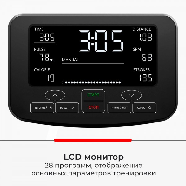 Тренажер обеспечивает плавность движения спортсмена во время гребка, позволяя забыть о «мертвых зонах». Используются направляющие из алюминия и высококачественные подшипники Тренажер оснащен анатомическим сидением. Длина рельс из алюминия составляет 110 см. Надежность модели обеспечивает усиленная рама и высококачественные комплектующие. Сочетание магнитного и воздушного сопротивления позволяет получить максимальную эффективность и естественность тренировки. Удобные педали имеют регулировку на ремнях. Для проверки пульса можно докупить кардиопояс. Тренажер можно компактно сложить для хранения.