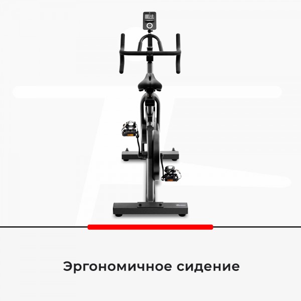 Конструкция использует магнитный тип нагрузки с плавной механической регулировкой. особо выделяют широкий спектр настройки положения спортсмена. Не только седло, но и руль можно настроить в двух плоскостях. Занять комфортное положение сможет спортсмен ростом до 2 м. Ремешки на педалях также регулируются.