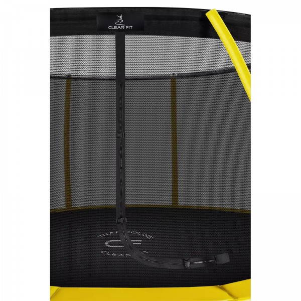 Модель оснащена защитной сетью с внутренним креплением, не давая доступа к пружинному блоку. Материал сети устойчив к воздействию ультрафиолета, может использовать в пределах от -40 до 80 градусов по Цельсию. На входе в батут установлена надежная молния и карабины. Стойки конструкции имеют специальные водостойкие мягкие чехлы.