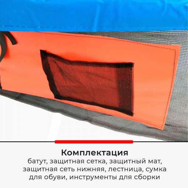 Модели имеют внутреннюю сеть из особопрочного нейлона со входом на молнии. Пространство под батутом закрыто от проникновения детей, животных и посторонних предметов дополнительной сетью. В комплект входит лестница и сумка для обуви, а также инструменты для сборки.