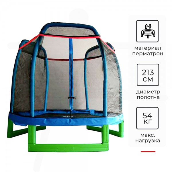 Стальные пружины надежно удерживают прыжковое полотно из перматрона. Есть защитный кожух пружинного блока. Сеть закрывается на молнию снаружи, поэтому малыш изнутри её не откроет. Дополнительно можно купить лестницу.
