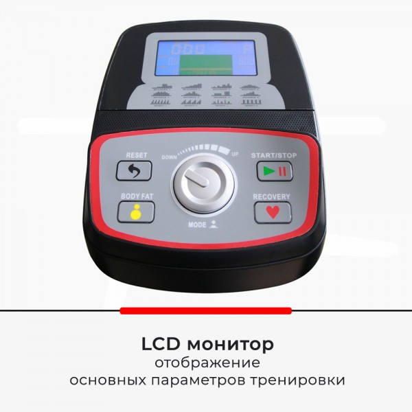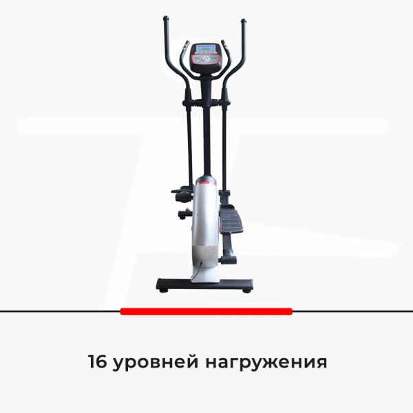 Тренажер предлагает 16 уровней нагрузки (электронная настройка). Рифленая поверхность педалей препятствует скольжению. Длина шага составляет 40 см, а Q-фактор - 20 см. Датчики пульса вмонтированы в поручни. Есть подставка для планшета.