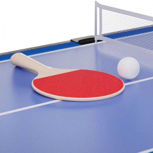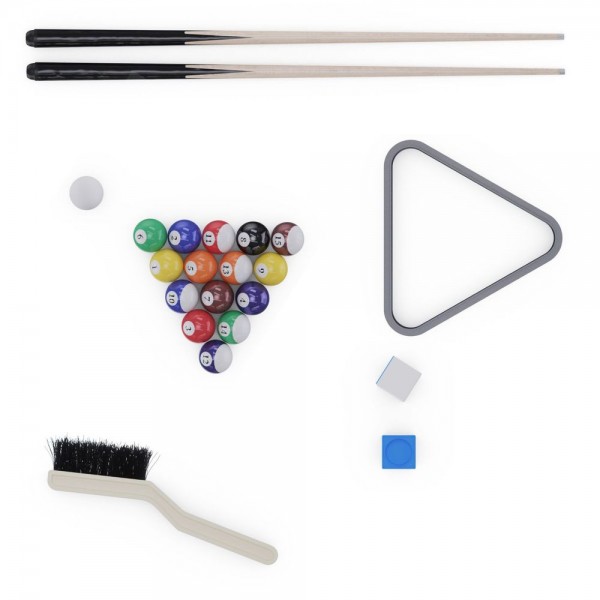 В комплект входят необходимые аксессуары (мячи, ракетки, биты и шайбы, 2 кия и т.д.). Вентилятор в комплект не входит.