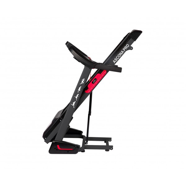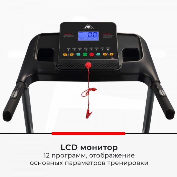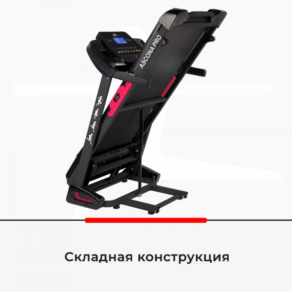Тренажер опирается на прочную раму и надежную деку, включает двигатель на 2,5 л.с. для скорости забега до 18 км/ч. Наклон можно выставить до 6 градусов электронно. На поручнях вмонтированы клавиши регулировки движения и датчики пульса. Есть возможность подключить кардиопояс для более точных показаний (в комплект не входит). Дорожку можно компактно сложить.